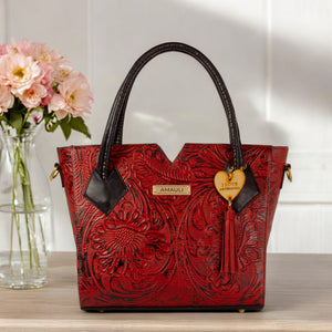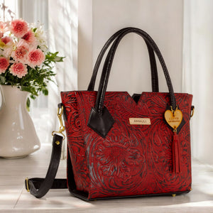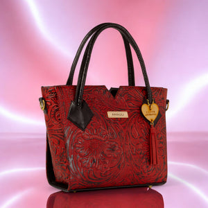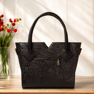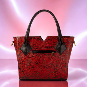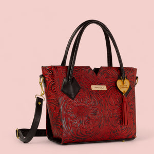 VALERIA, disponible en negro y rojo con negro, está confeccionado en piel vacuno troquelado, creando un bolso que combina fuerza y elegancia. Este modelo es ideal para quienes buscan un diseño atrevido y original.